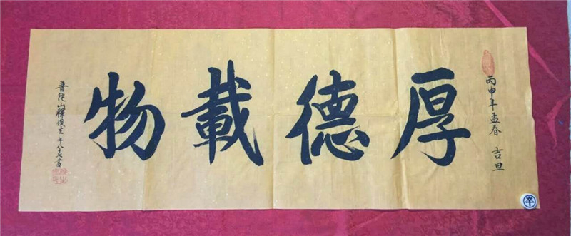 厚德载物 释俊生法师,1930年初生,著名佛教大师。释俊生法师从1973年受邀普陀山普济寺任住持,常负责接待国家领导人及海外要员。其佛学精湛,国学精通,琴棋书画无所不能;尤其是其书法艺术是当今佛教界瑰宝。